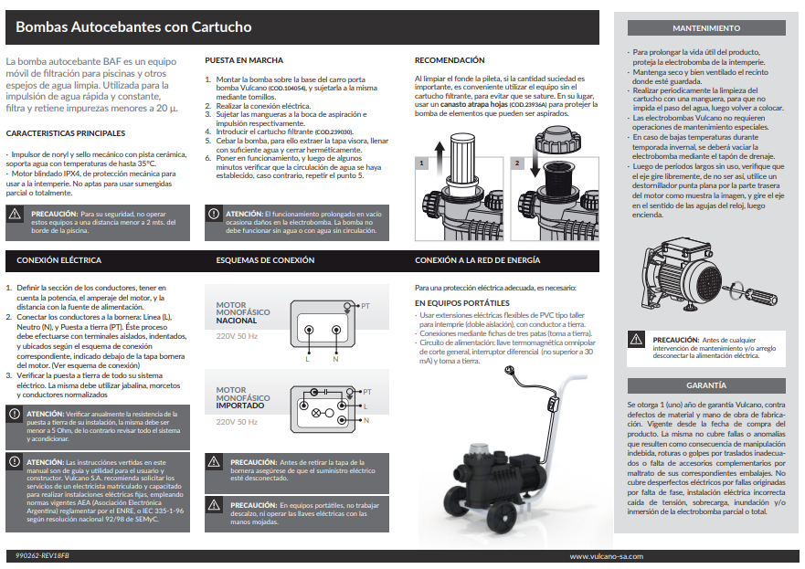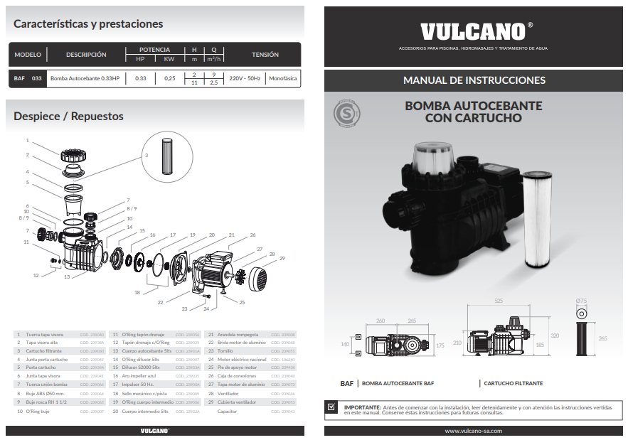 Bomba autocebante BAF 033-2 Vulcano de 0.33 HP, 220V-50HZ, bobinada en aluminio,con cartucho filtrante incorporado. De cuerpo reforzado y conexiones con uniones dobles; con bujes de rosca hembra 1 1/2” para caños de polipropileno y lisos de Ø 50 mm para pegar caños de PVC. Éste equipo destaca por su practicidad, y su fácil traslado para realizar el filtrado manual de piscinas de hasta 10 m³.
