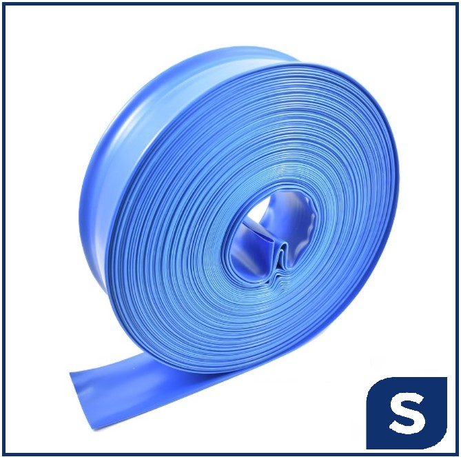 Manguera plana de PVC resistente, sección ø 38mm y 15m de largo. Manguera tipo manga ideal para usar como manguera de desagote de piscina. Opción económica, práctica y de fácil manipulación. Al guardar ocupa muy poco espacio.